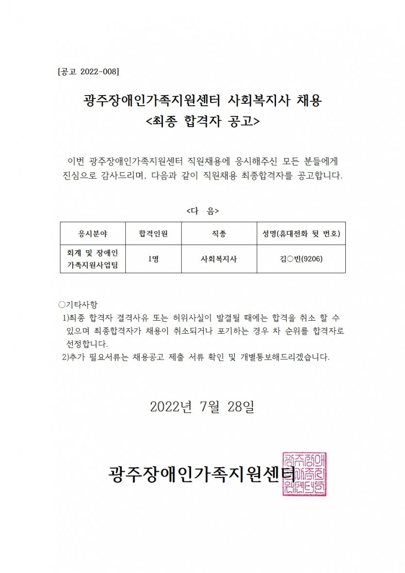 [공고 2022-008]광주장애인가족지원센터 사회복지사 최종합격자 공고