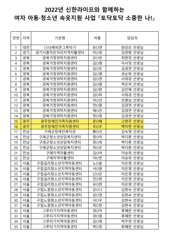 지원 선정 2022년 신한라이프 여자 아동청소년 속옷지원사업 <토닥토닥 소중한 나!> 선정