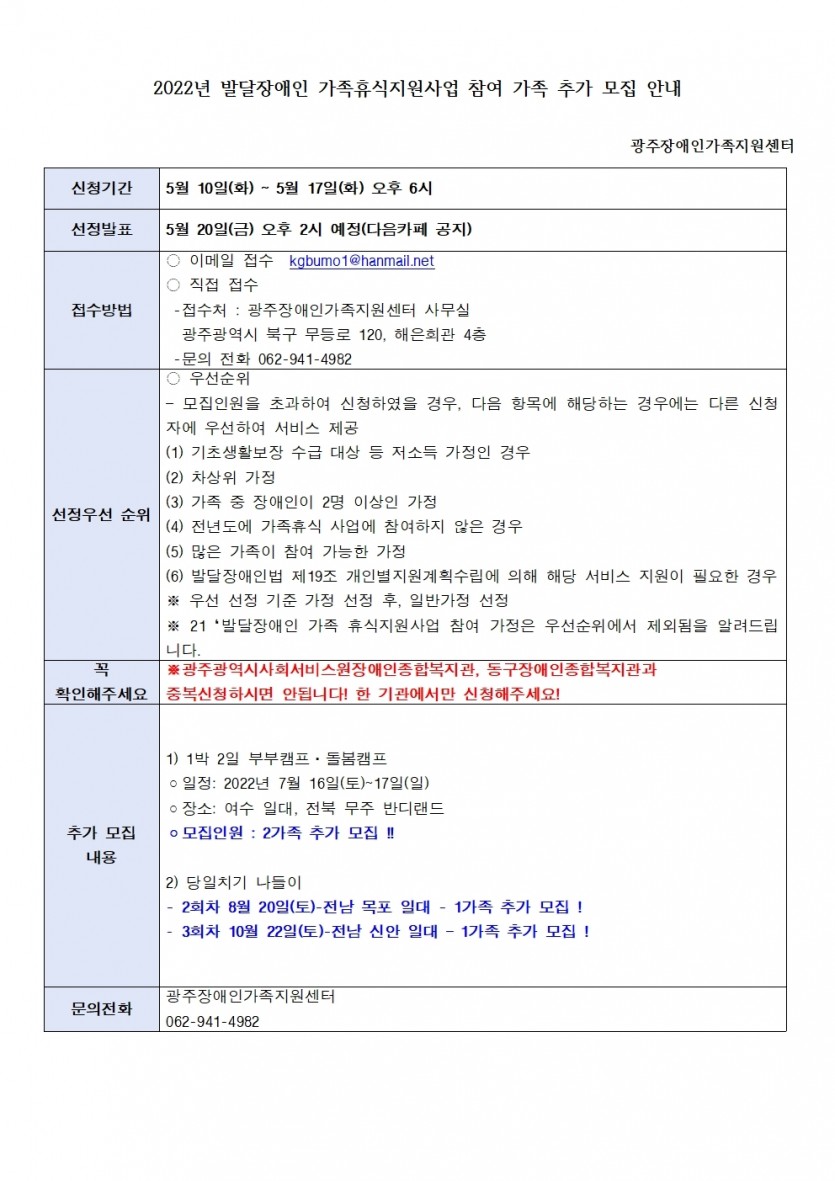 [모집 마감]2022년 발달장애인 가족휴식지원사업 참여 가족 추가 모집 안내