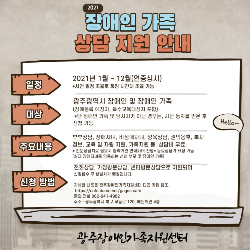광주장애인가족지원센터는 장애인 가족의 삶의 질 향상 및 안정적인