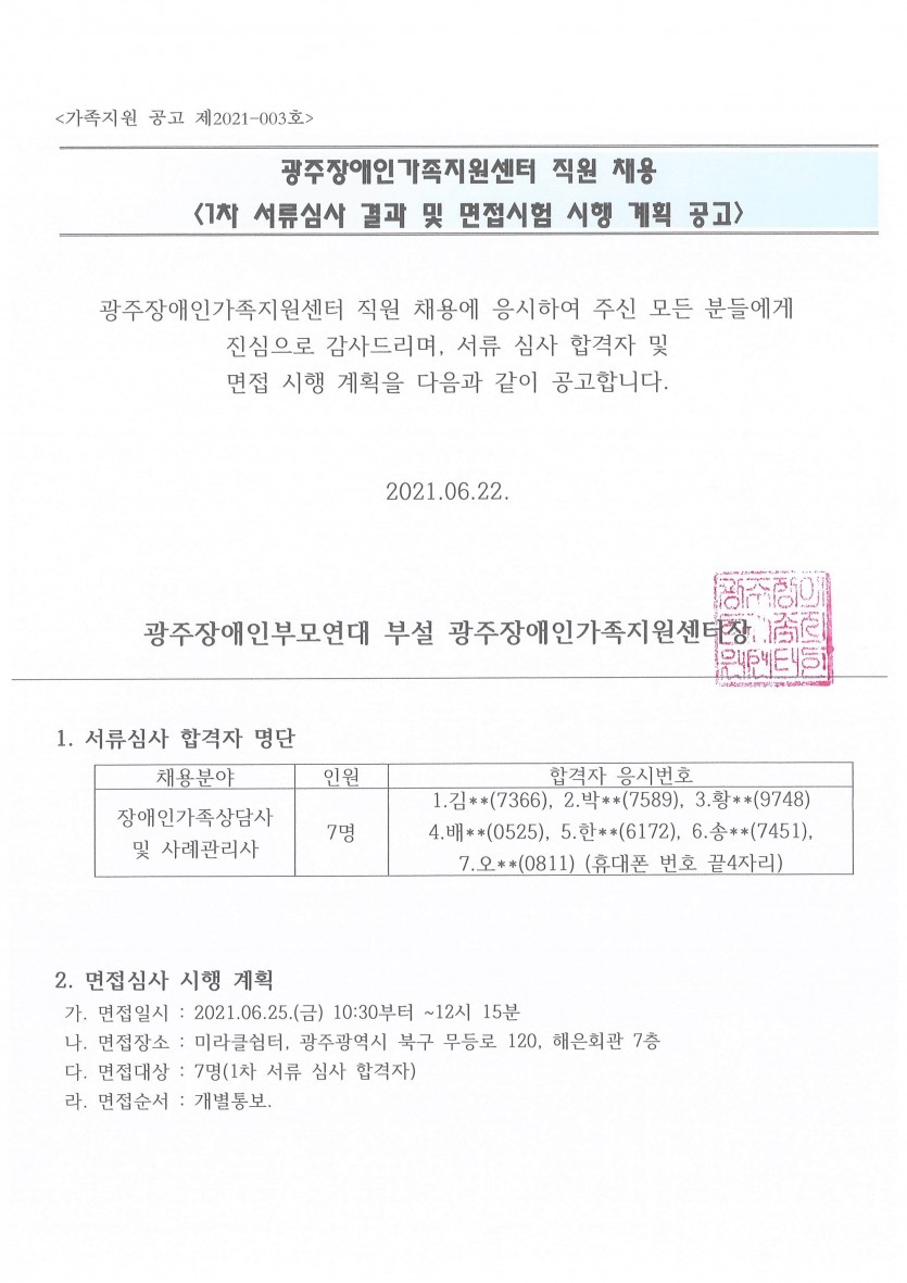 광주장애인가족지원센터 직원채용 1차서류 심사 결과 및 면접시험 시행 계획공고