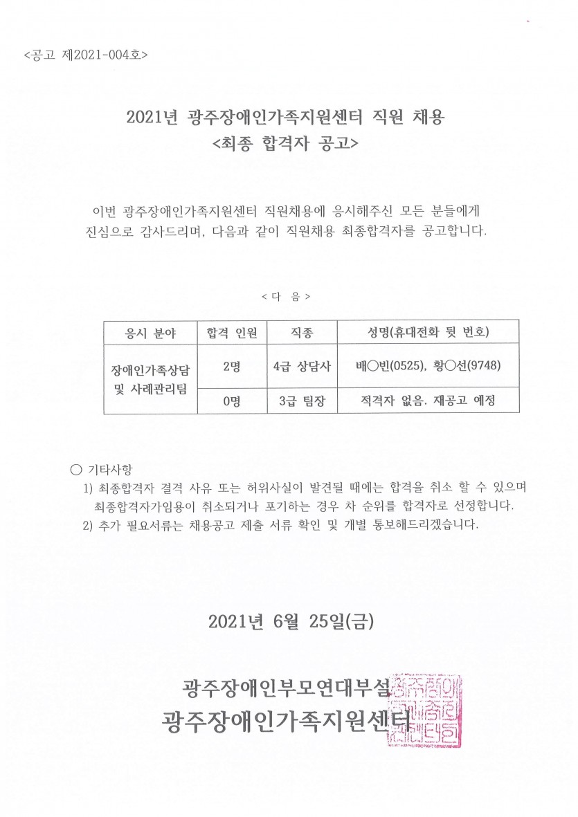 2021년 광주장애인가족지원센터 직원채용 합격자 공고