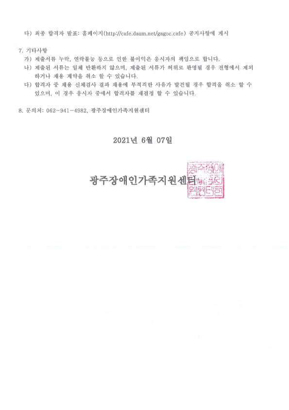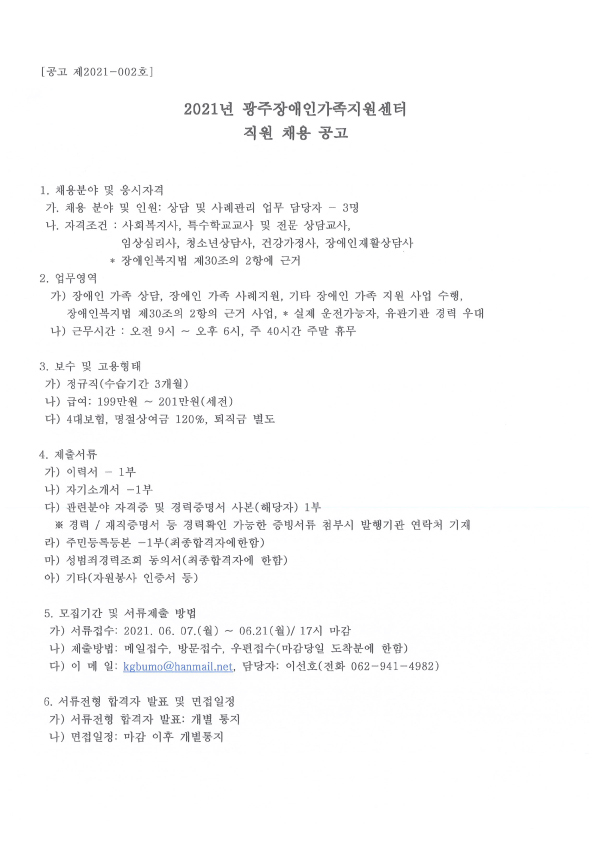 2021년 광주장애인가족지원센터 직원 채용 공고 - 06.07