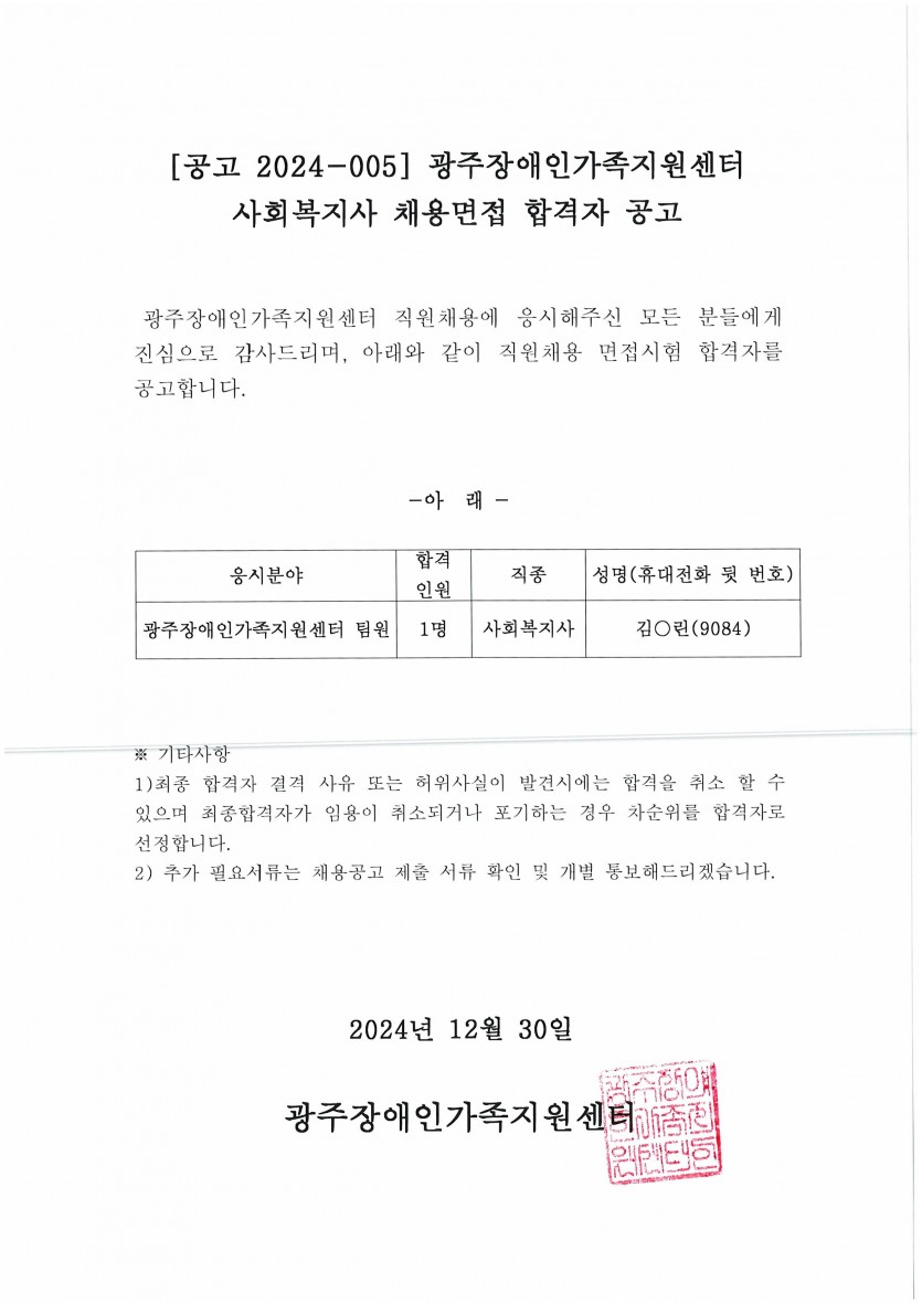 광주장애인가족지원센터 면접시험 합격자 공고-1230