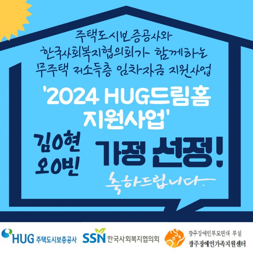 주택도시보증공사와 한국사회복지협의회가 함께하는 무주택저소득층 임차자금 지원사업 2024 HUG드림홈 지원사업에 광주장애인가족지원센터의 사례 김0현, 오0빈 가정이 선정되었습니다!! 축하드립니다.