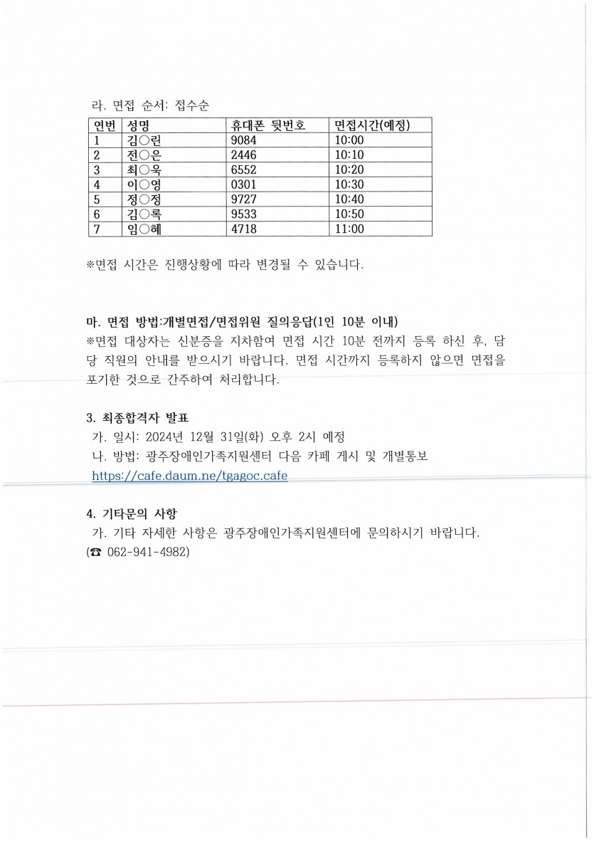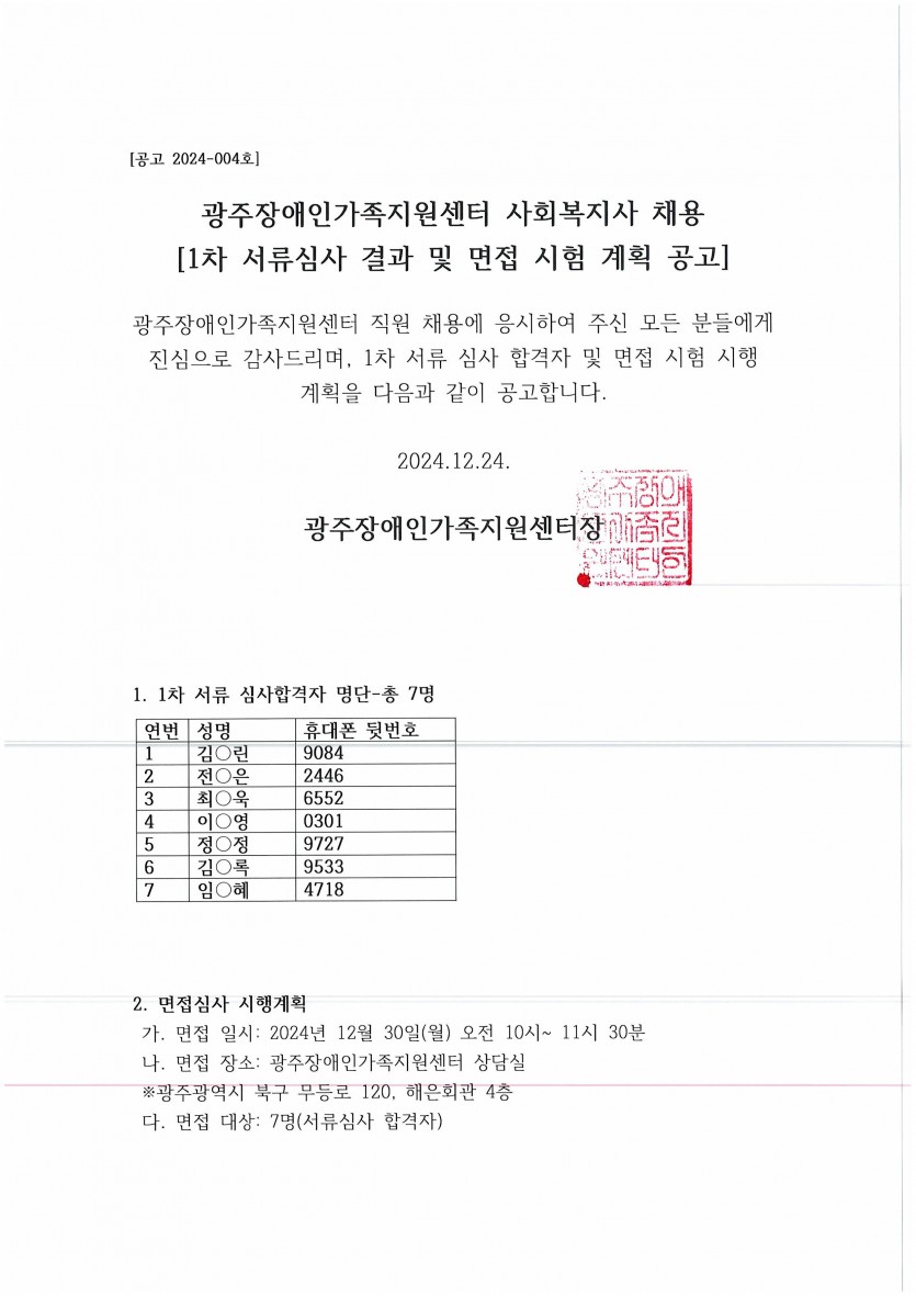광주장애인가족지원센터 사회복지사 채용 1차 서류심사 결과 및 면접 시험계획 공고