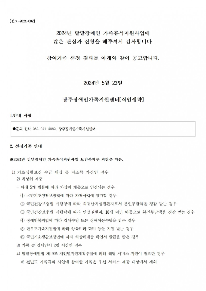 공지사항 [선정 발표]2024년 발달장애인 가족휴식지원사업 선정 발표-광주장애인가족지원센터