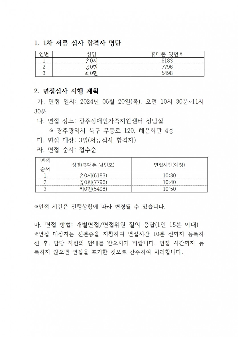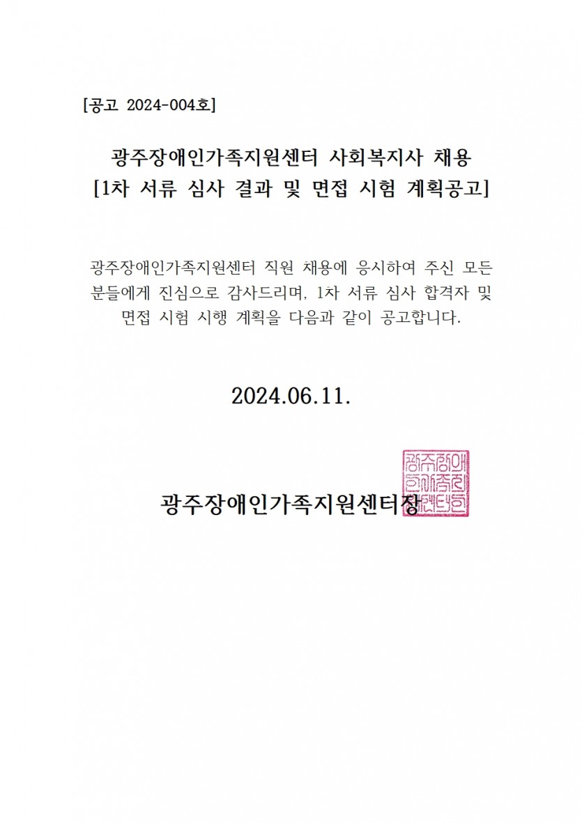 광주장애인가족지원센터 사회복지사 채용 1차 서류 심사결과 및 면접시험 계획공고