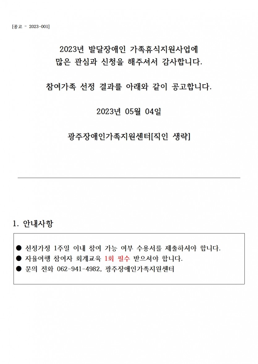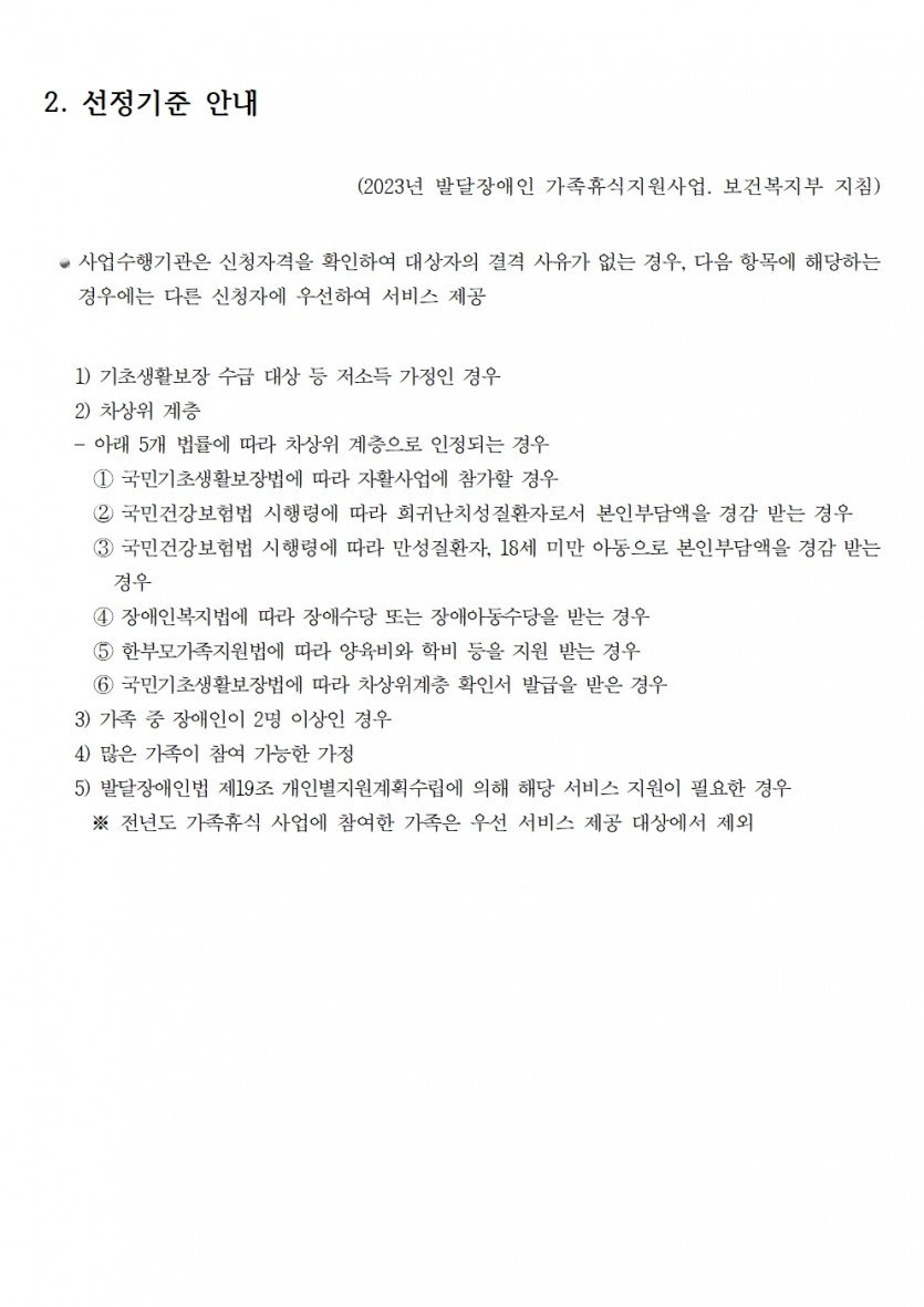 공지사항 2023년 발달장애인 가족휴식지원사업 선정 안내