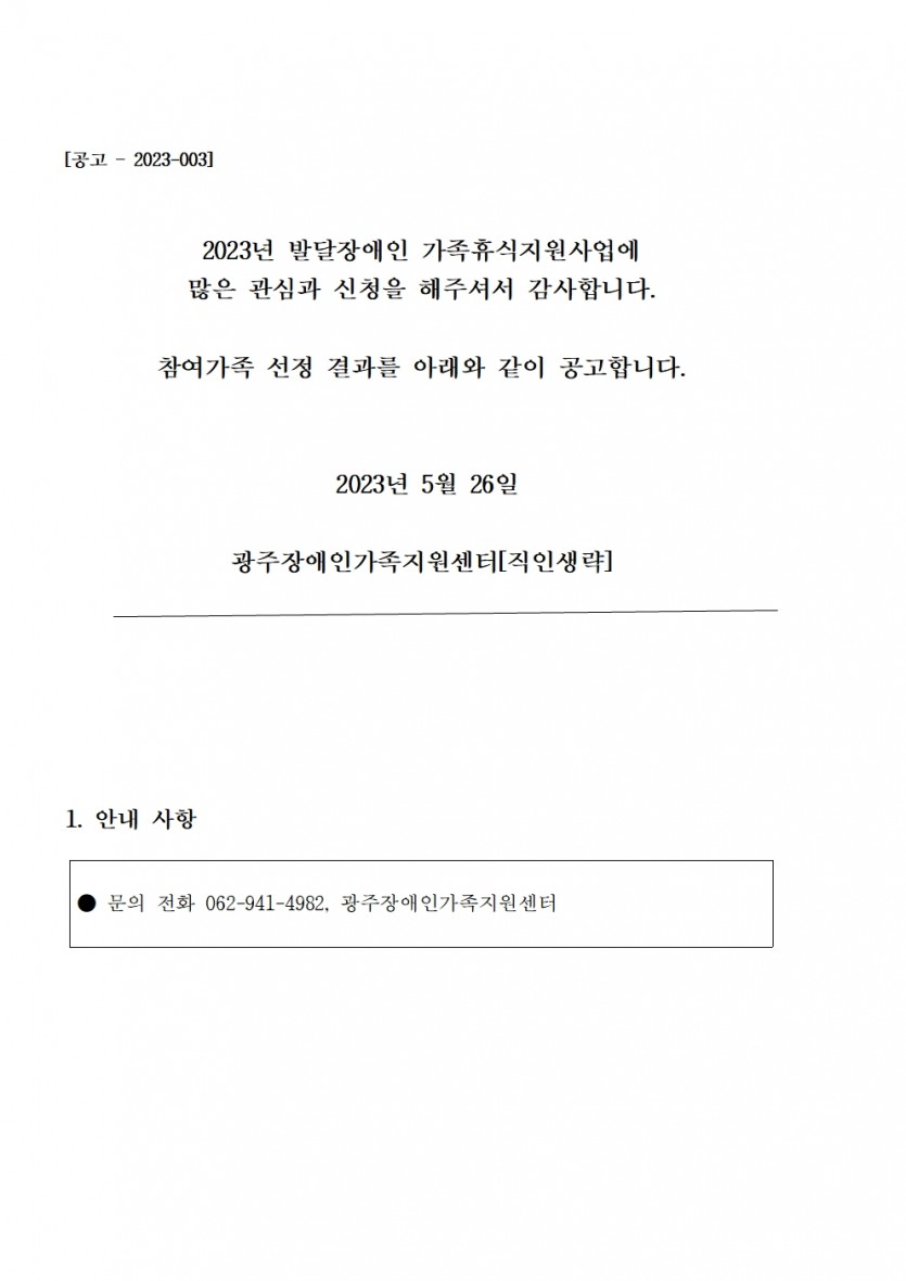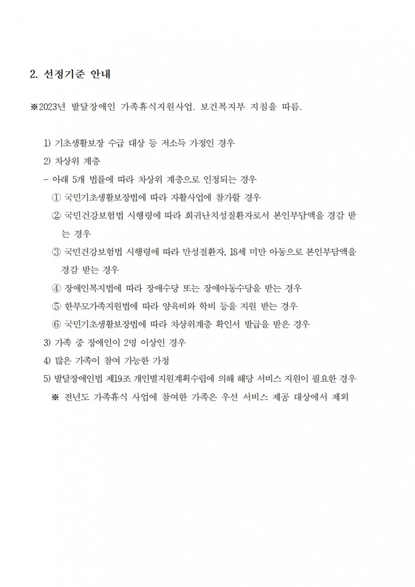 [추가모집 선정 결과] 2023년 발달장애인 가족휴식지원사업 선정 안내페이지 정보![]() 본문.