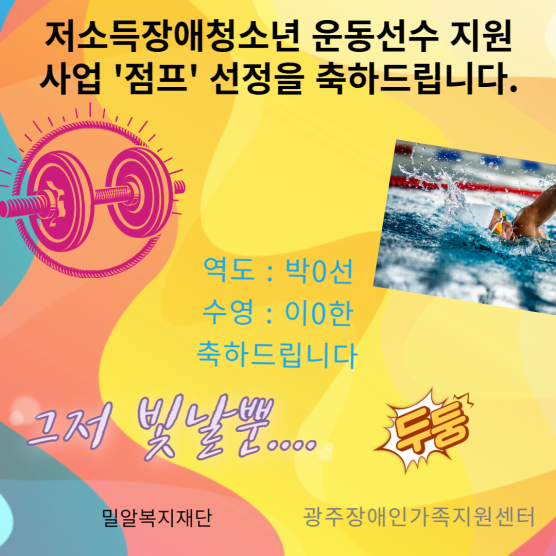저소득장애청소년 운동선수지원사업 '점프'에 광주장애인가족지원센터 사례가정 박0선, 이0한  학생들이 선정되었습니다!! 화이팅! 가즈아 !!
